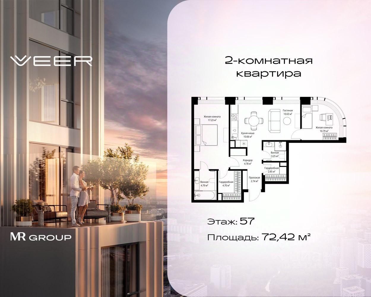 Продаётся 2-комнатная квартира общей площадью 72.42 м² без отделки в ЖК VEER на 57-м этаже 70 этажного дома.