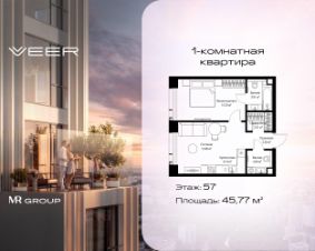 Продаётся 1-комнатная квартира общей площадью 45.77 м² без отделки в ЖК VEER на 57-м этаже 70 этажного дома.