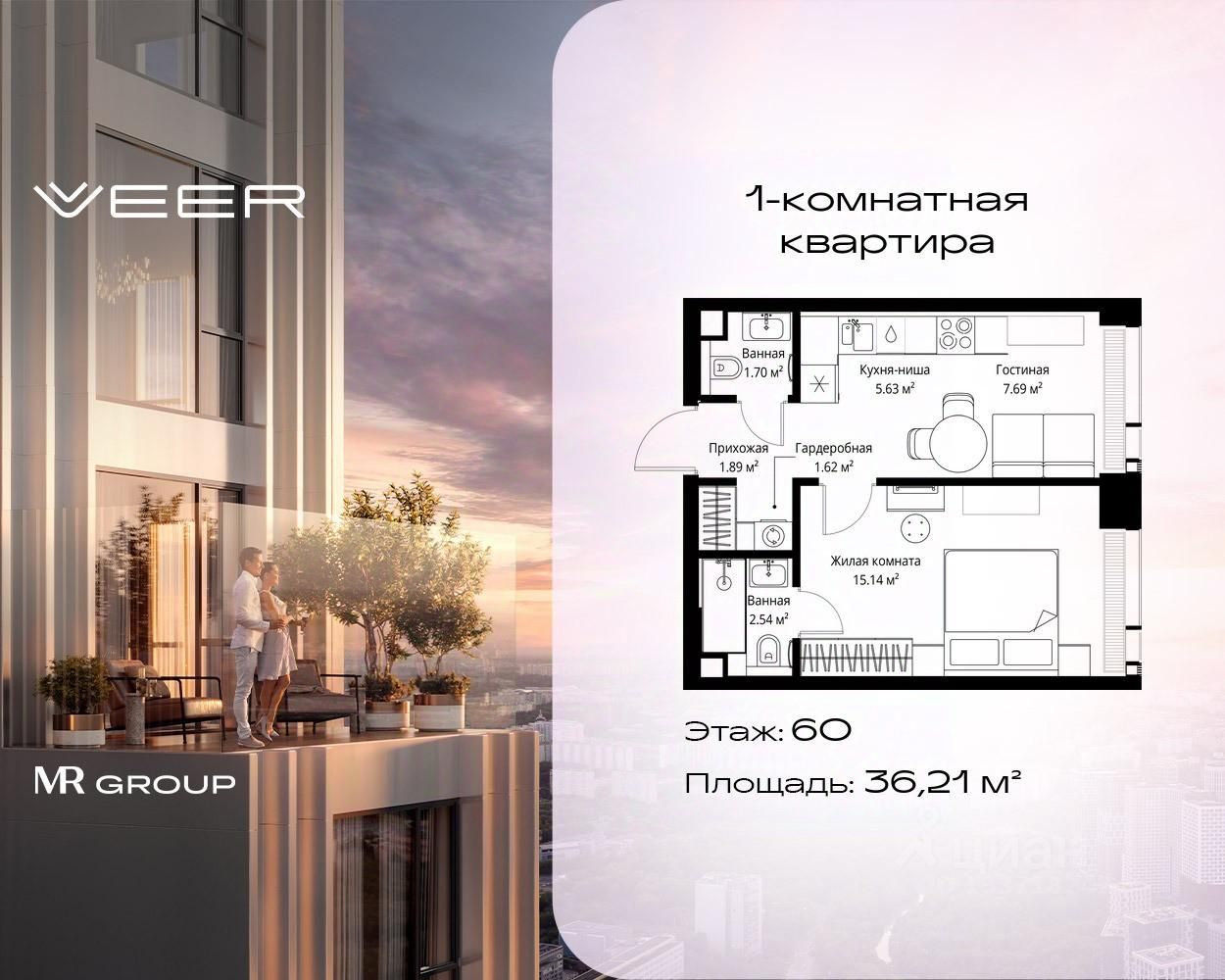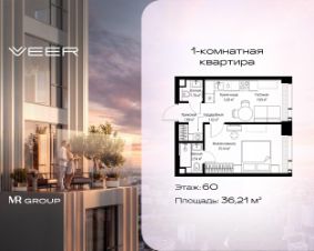 Продаётся 1-комнатная квартира общей площадью 36.21 м² без отделки в ЖК VEER на 60-м этаже 70 этажного дома.