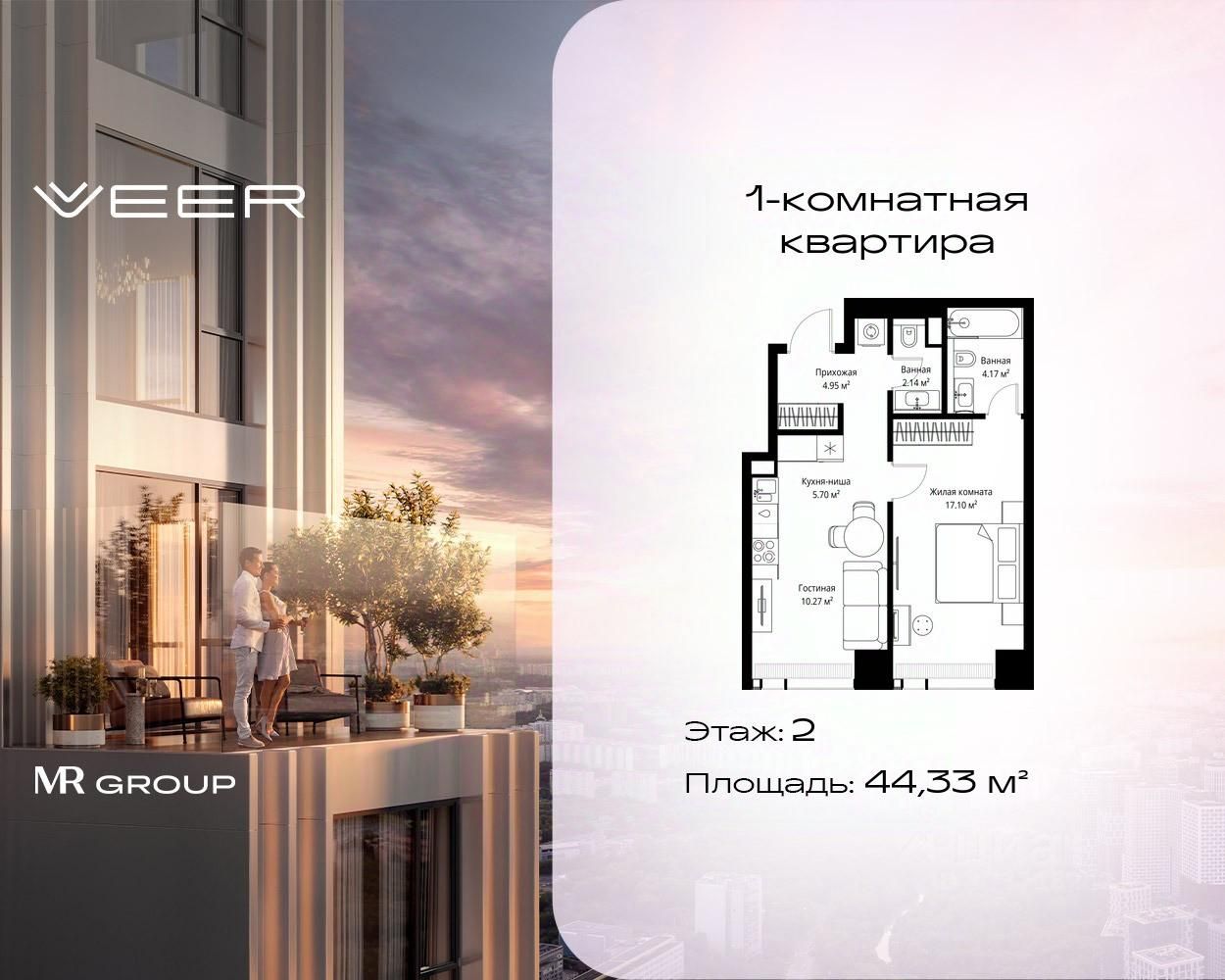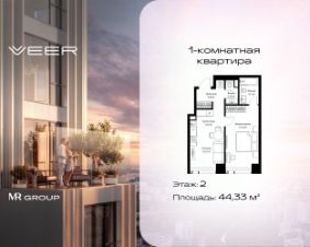 Продаётся 1-комнатная квартира общей площадью 44.33 м² без отделки в ЖК VEER на 2-м этаже 70 этажного дома.