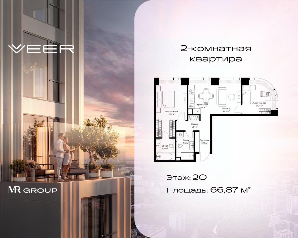 Продаётся 2-комнатная квартира общей площадью 66.87 м² без отделки в ЖК VEER на 20-м этаже 70 этажного дома.