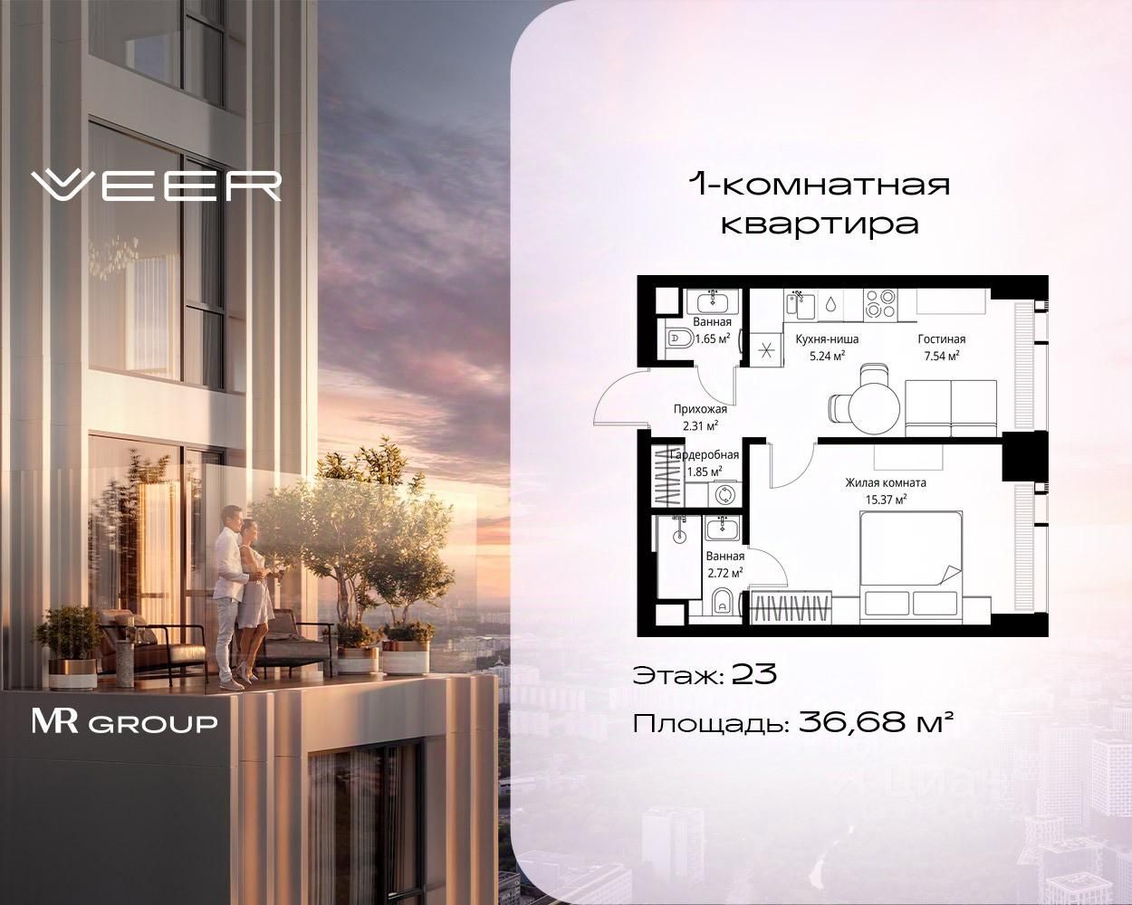 Продаётся 1-комнатная квартира общей площадью 36.68 м² без отделки в ЖК VEER на 23-м этаже 70 этажного дома.