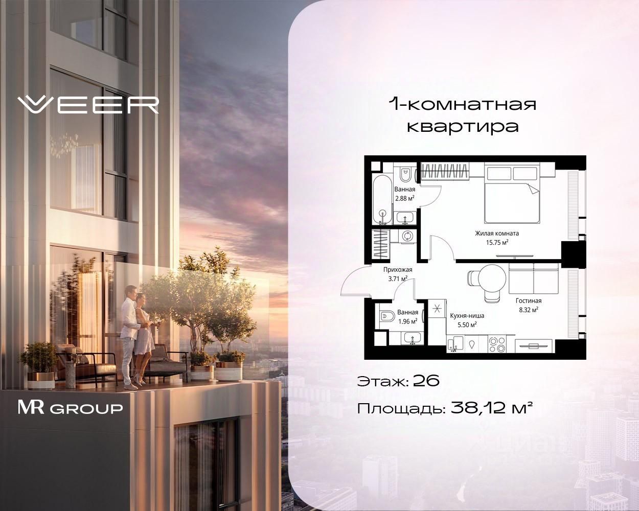 Продаётся 1-комнатная квартира общей площадью 38.12 м² без отделки в ЖК VEER на 26-м этаже 70 этажного дома.