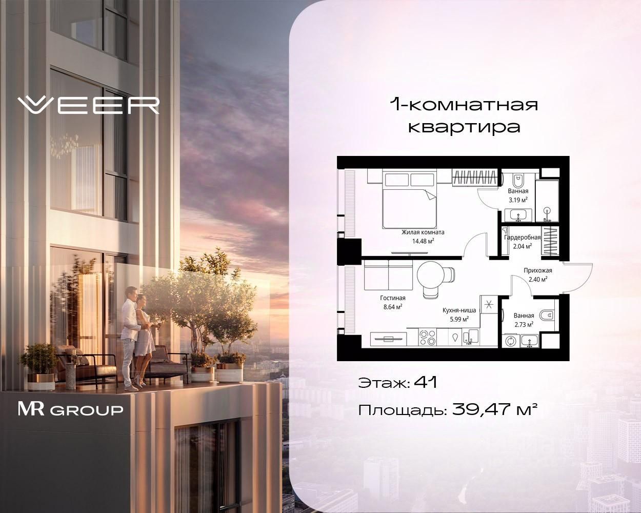 Продаётся 1-комнатная квартира общей площадью 39.47 м² без отделки в ЖК VEER на 41-м этаже 70 этажного дома.