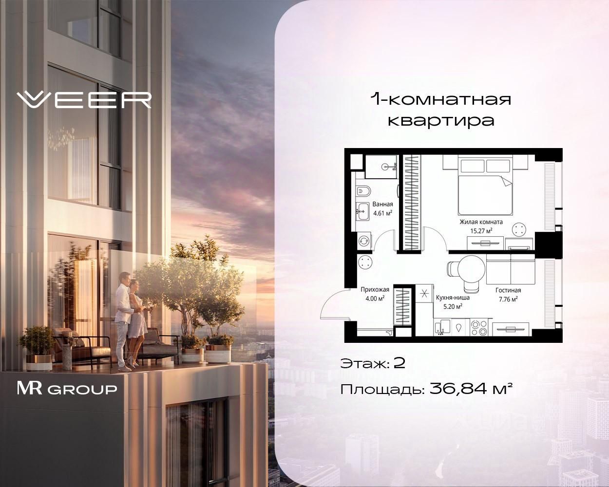 Продаётся 1-комнатная квартира общей площадью 36.84 м² без отделки в ЖК VEER на 2-м этаже 70 этажного дома.