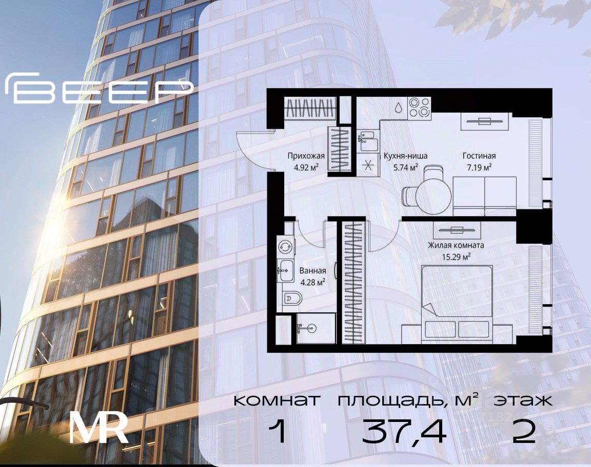 Продаётся 1-комнатная квартира общей площадью 37.42 м² без отделки в ЖК Веер на 2-м этаже 70 этажного дома.