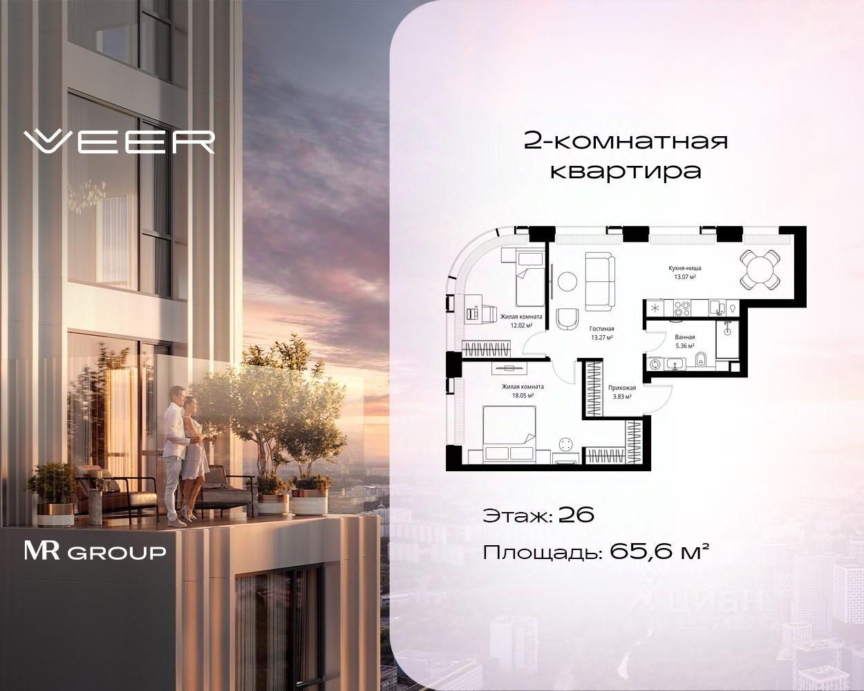 Продаётся 2-комнатная квартира общей площадью 65.60 м² без отделки в ЖК VEER на 26-м этаже 35 этажного дома.