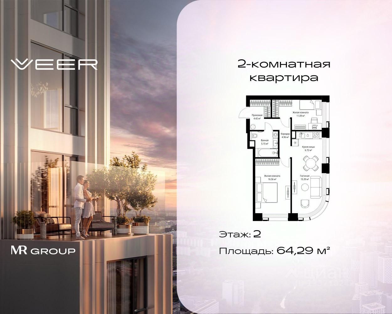 Продаётся 2-комнатная квартира общей площадью 64.29 м² без отделки в ЖК VEER на 2-м этаже 35 этажного дома.