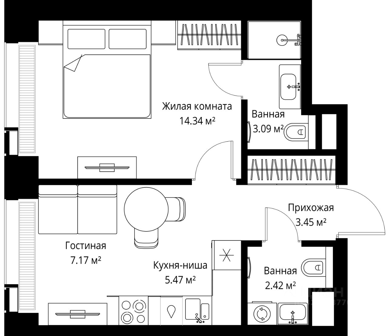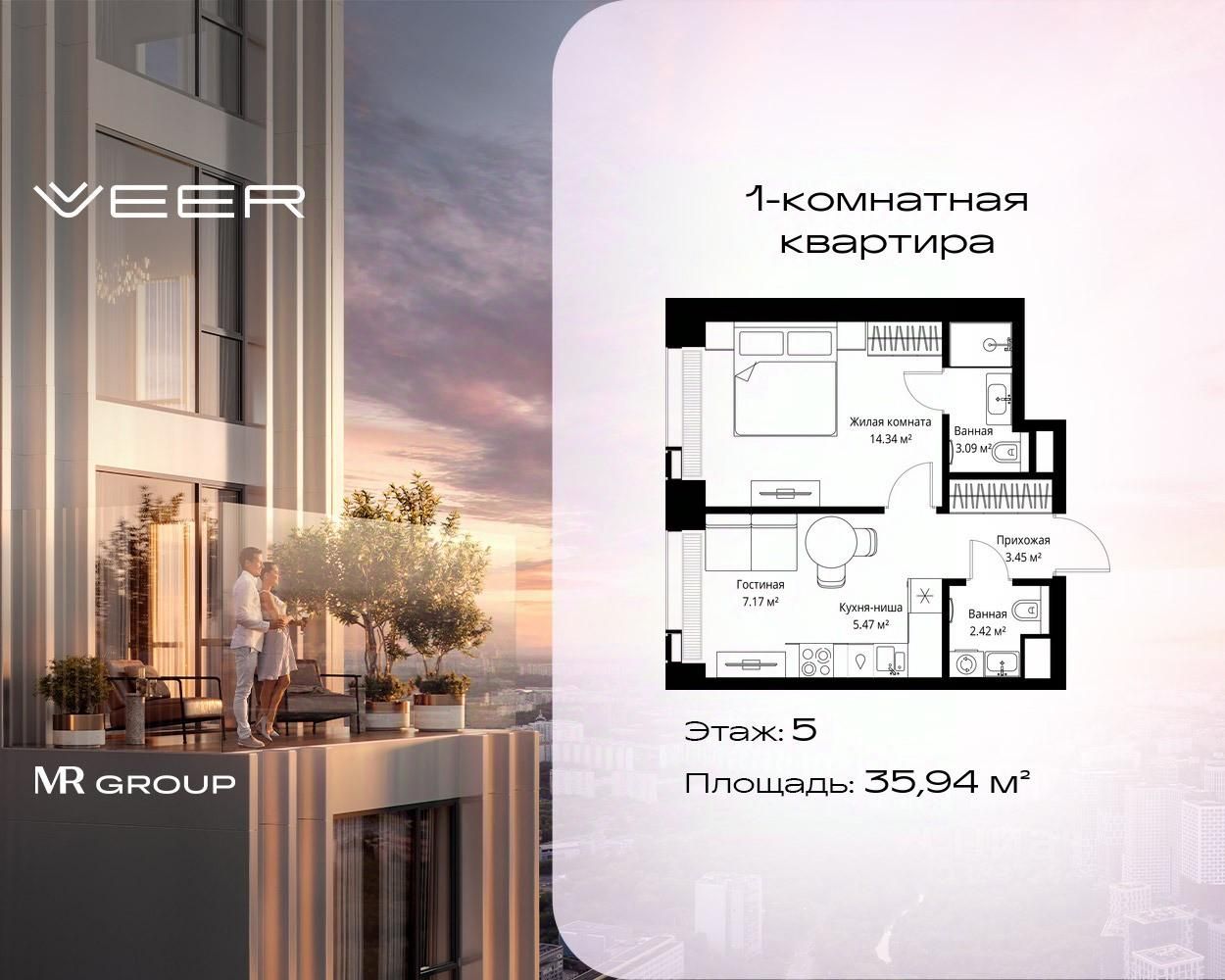 Продаётся 1-комнатная квартира общей площадью 35.94 м² без отделки в ЖК VEER на 5-м этаже 35 этажного дома.