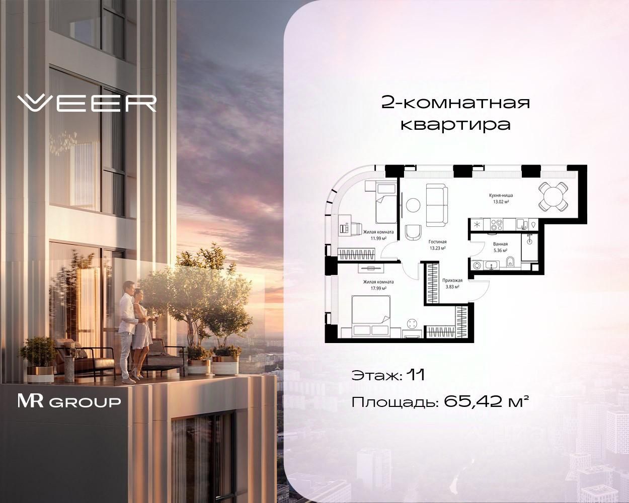 Продаётся 2-комнатная квартира общей площадью 65.42 м² без отделки в ЖК VEER на 11-м этаже 35 этажного дома.