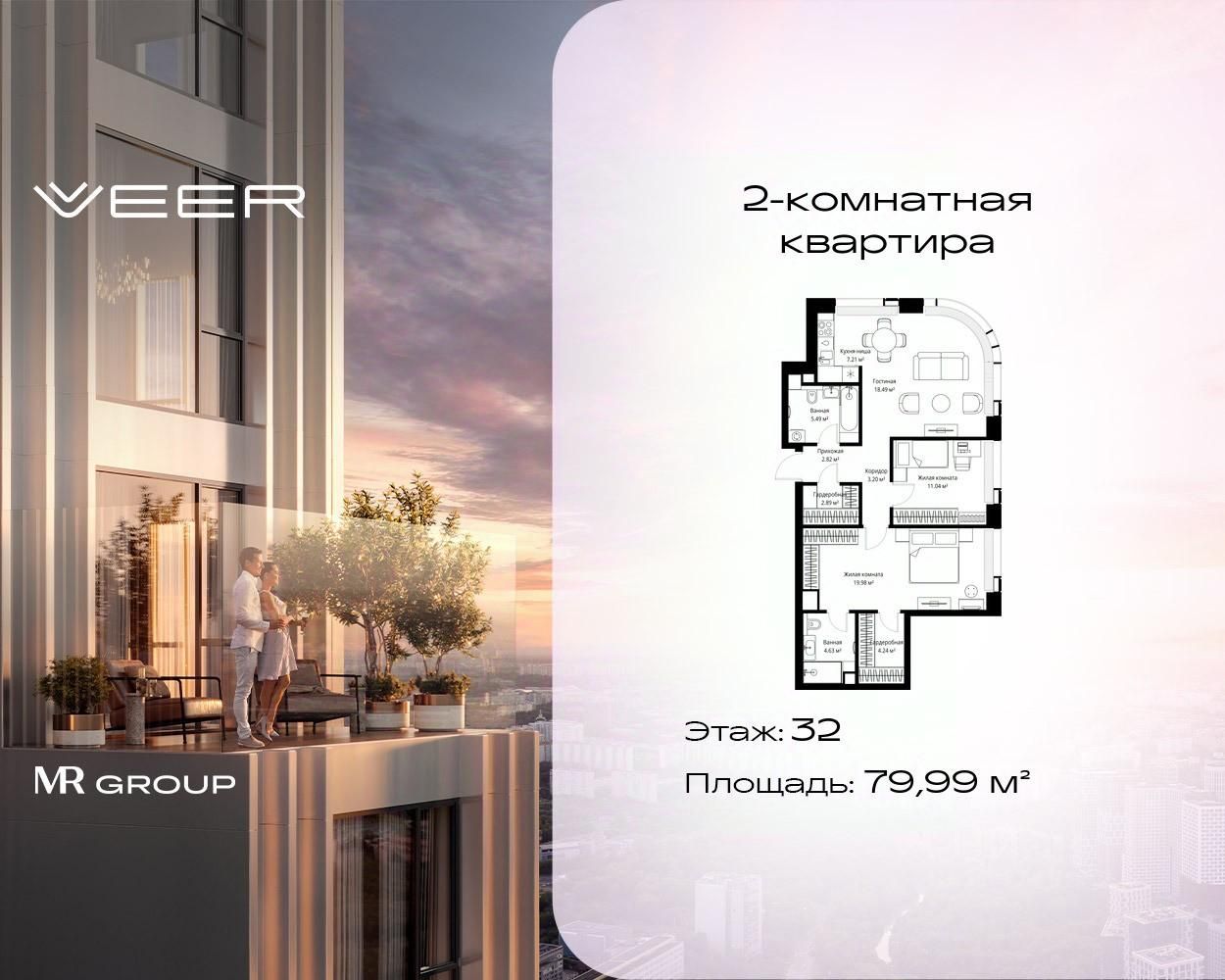 Продаётся 2-комнатная квартира общей площадью 79.99 м² без отделки в ЖК VEER на 32-м этаже 35 этажного дома.