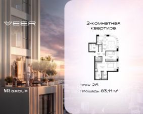 Продаётся 2-комнатная квартира общей площадью 83.11 м² без отделки в ЖК VEER на 26-м этаже 35 этажного дома.