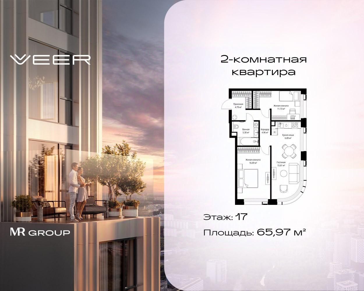 Продаётся 2-комнатная квартира общей площадью 65.97 м² без отделки в ЖК VEER на 17-м этаже 35 этажного дома.