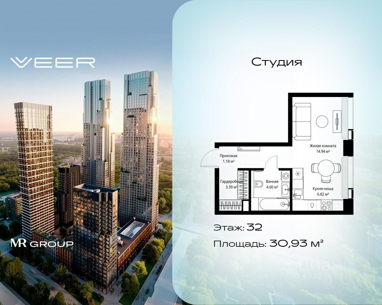 Продаётся студия общей площадью 30.93 м² без отделки в ЖК VEER на 32-м этаже 35 этажного дома.