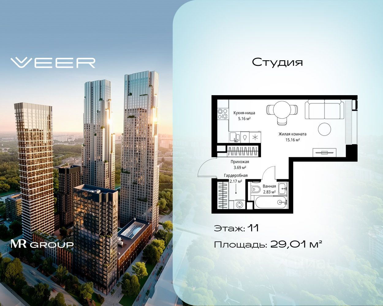 Продаётся студия общей площадью 29.01 м² без отделки в ЖК VEER на 11-м этаже 35 этажного дома.