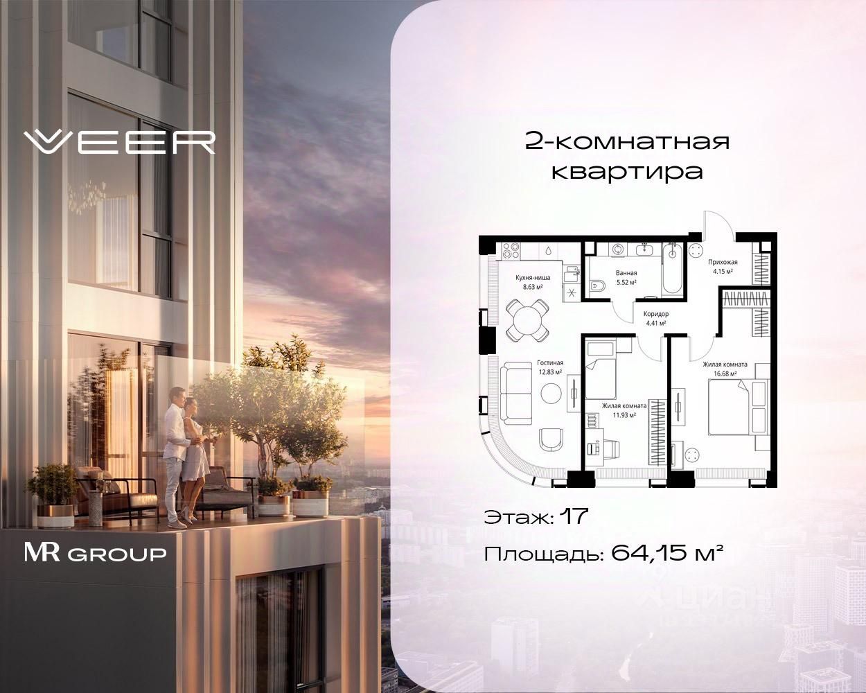 Продаётся 2-комнатная квартира общей площадью 64.15 м² без отделки в ЖК VEER на 17-м этаже 35 этажного дома.