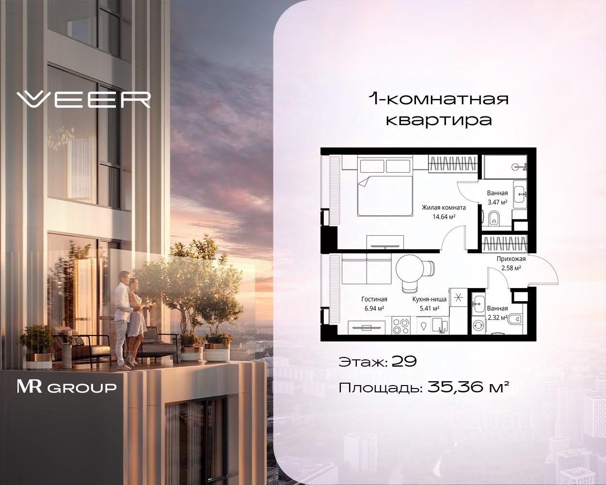 Продаётся 1-комнатная квартира общей площадью 35.36 м² без отделки в ЖК VEER на 29-м этаже 35 этажного дома.