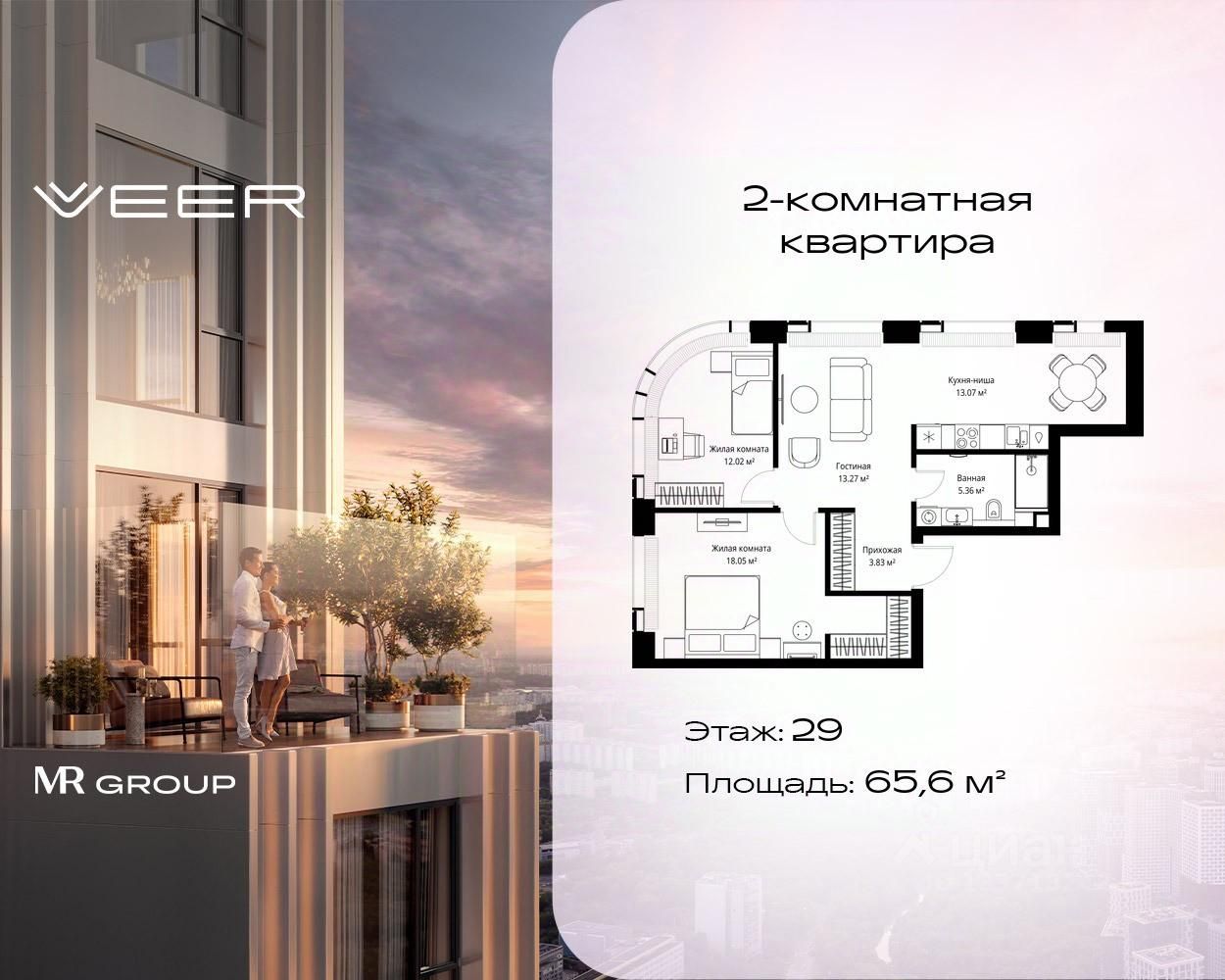 Продаётся 2-комнатная квартира общей площадью 65.60 м² без отделки в ЖК VEER на 29-м этаже 35 этажного дома.