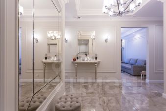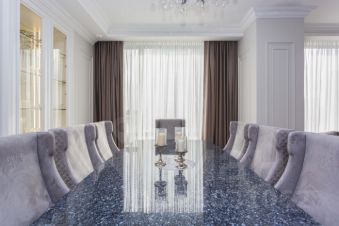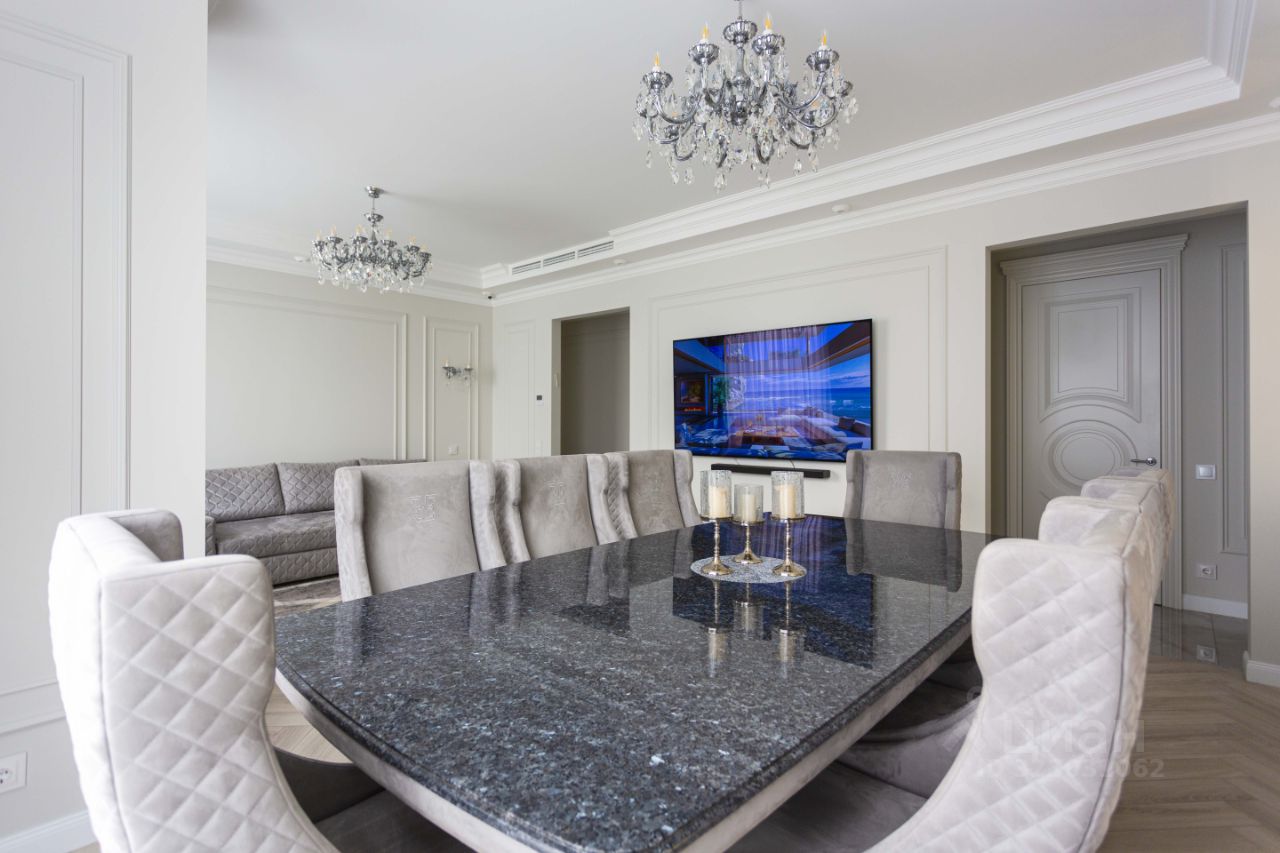 Мебель в кухне и в гостинной - estetica vision (стол, стулья, диваны), техника: Smeg, холодильник - Liebherr, стиральная и сушильная машины Miele. Камень стола, острова, кухонного гарнитура - кварцит, в гостинной - лабладор. В мастер-спальне - мебель Италия. Спальня (мальчика) - кровать mebel and zieght с подъемным механизмом. Спальня (девочка) - Angelic Room (Полный комплект мебели). Детская спальня - диван с раскладным механизмом. В прихожей - консоль Estetica Vision (мрамор)