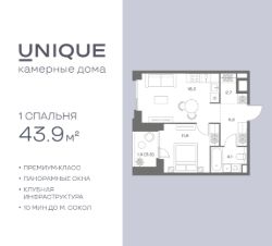 Продается 1-к. квартира номер 295 общей площадью 43.9 кв.м. на 3-м этаже 9 этажного дома, корпус UNIQUE (премиум-класс). Без отделки.
