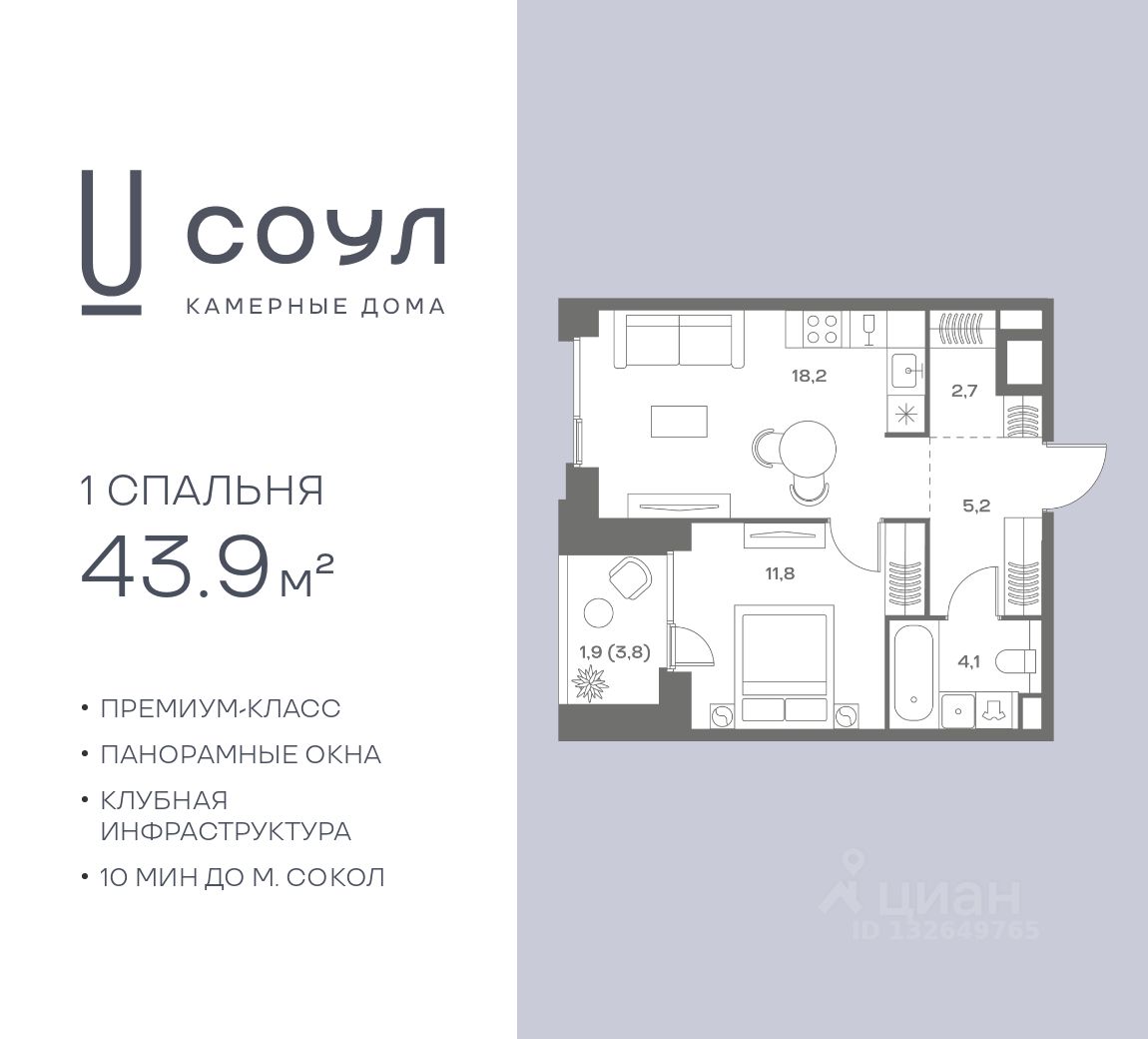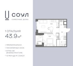 Продается 1-к. квартира номер 295 общей площадью 43.9 кв.м. на 3-м этаже 9 этажного дома, камерные дома СОУЛ (премиум-класс). Без отделки.