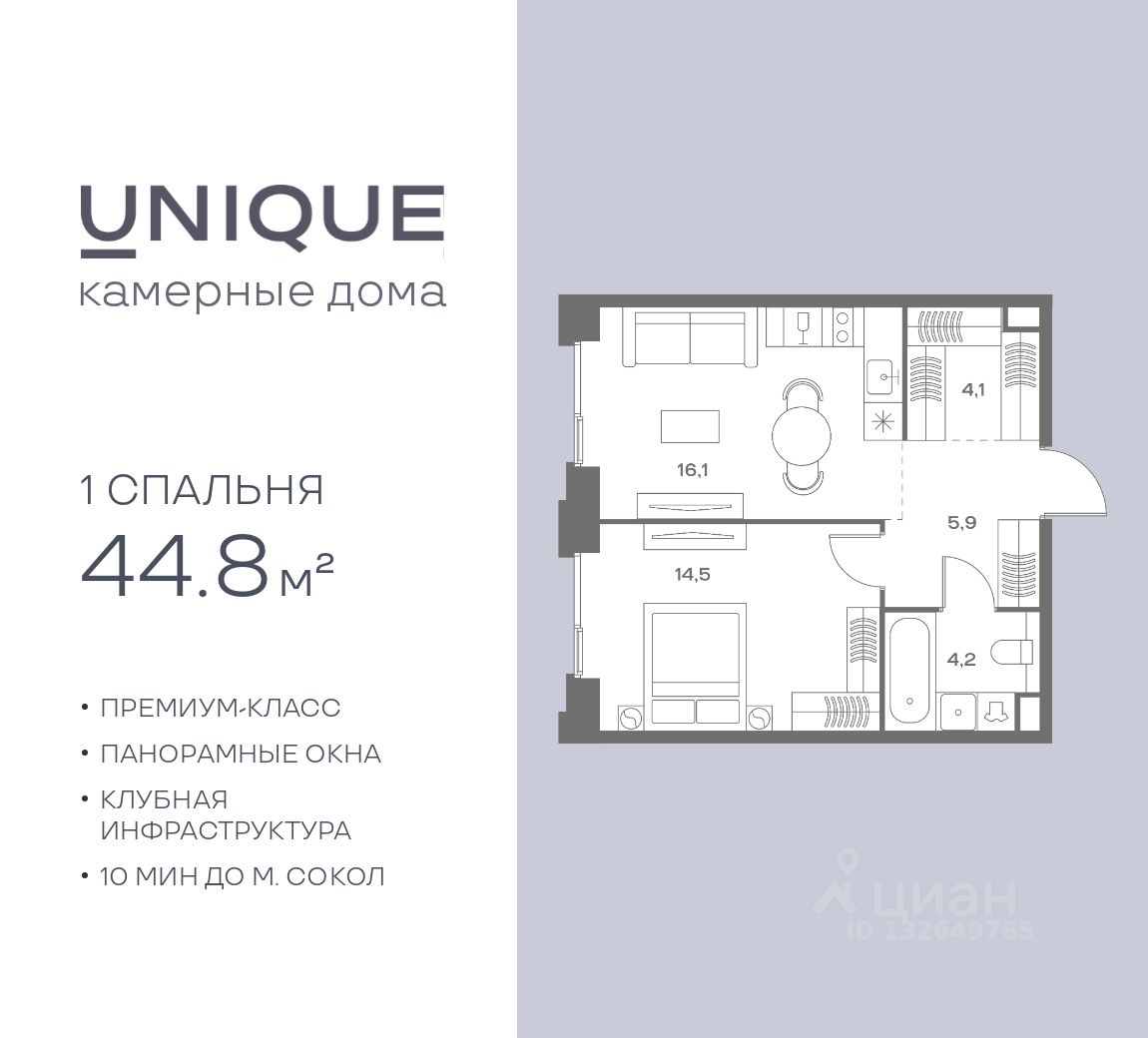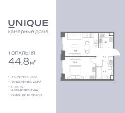 Продается 1-к. квартира номер 91 общей площадью 44.8 кв.м. на 3-м этаже 8 этажного дома, корпус UNIQUE (премиум-класс). Без отделки.