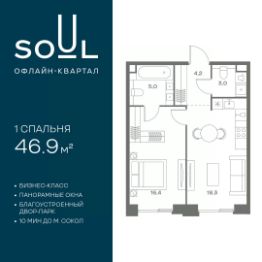 Продается 1-к. квартира номер 9 общей площадью 46.9 кв.м. на 3-м этаже 9 этажного дома, корпус UNIQUE (премиум-класс). Без отделки.