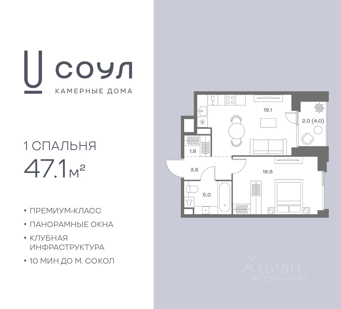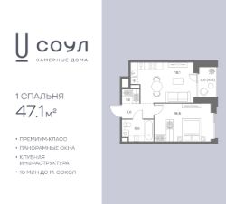 Продается 1-к. квартира номер 155 общей площадью 47.1 кв.м. на 3-м этаже 9 этажного дома, камерные дома СОУЛ (премиум-класс). Без отделки.
