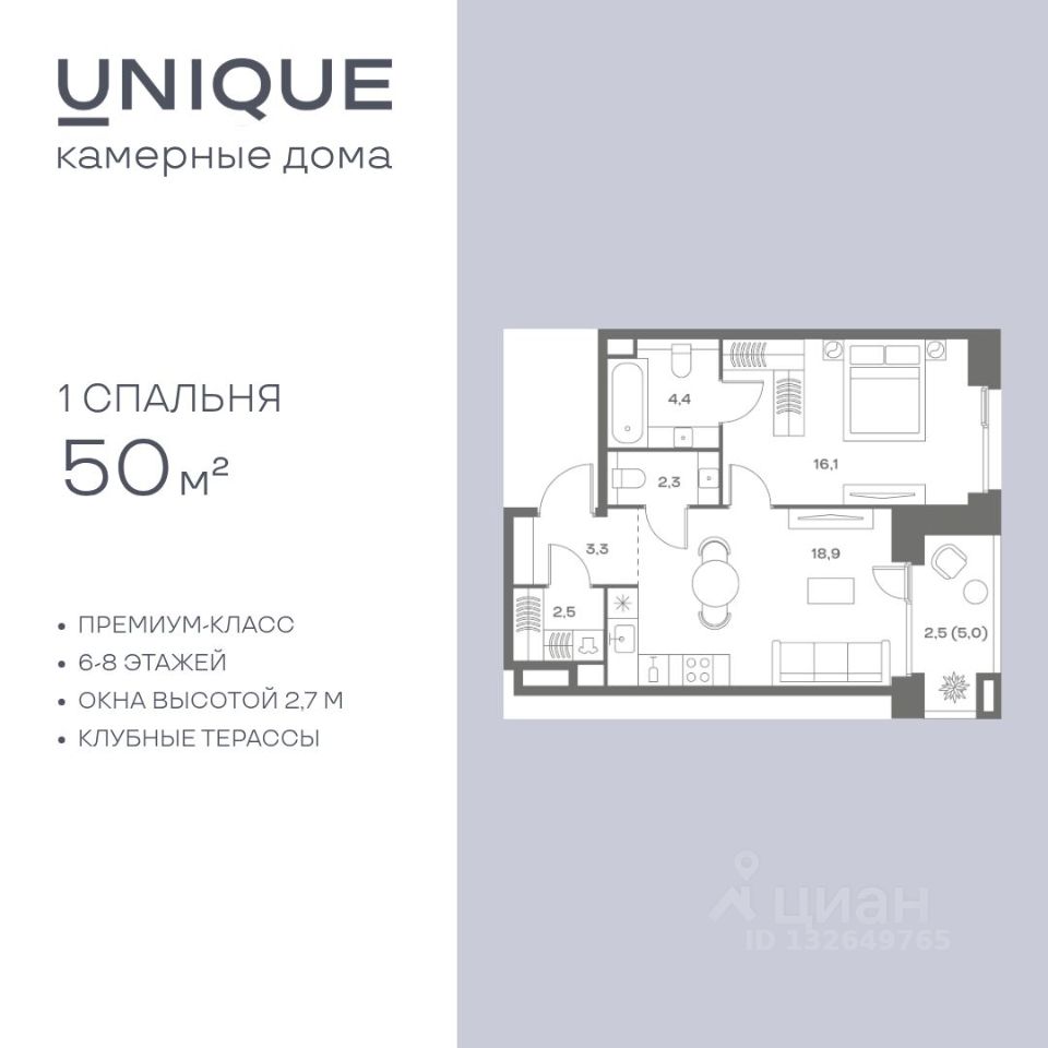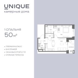 Продается 1-к. квартира номер 105 общей площадью 50 кв.м. на 5-м этаже 8 этажного дома, корпус UNIQUE (премиум-класс). Без отделки.