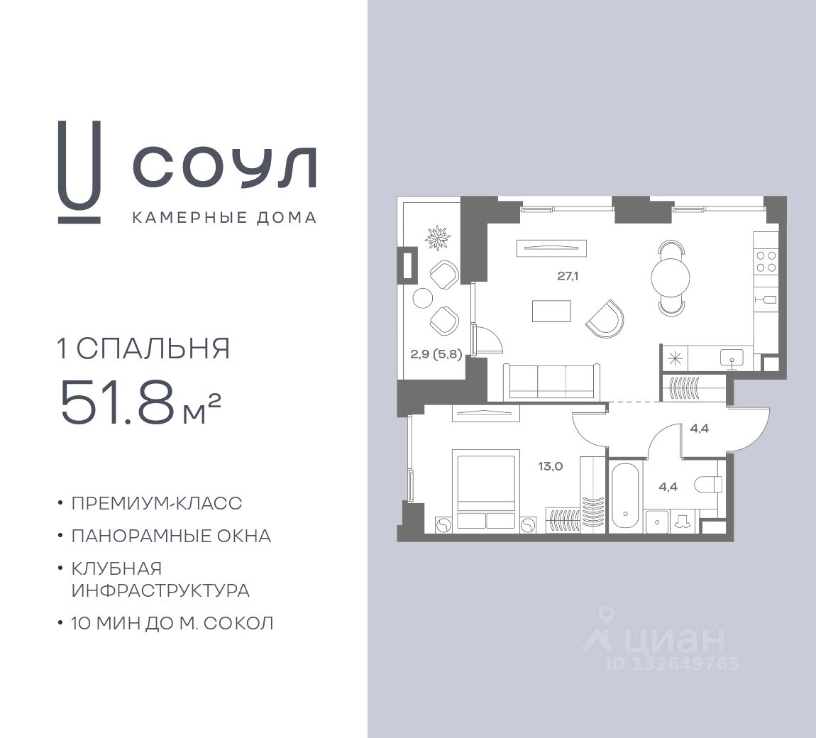 Продается 1-к. квартира номер 296 общей площадью 51.8 кв.м. на 3-м этаже 9 этажного дома, камерные дома СОУЛ (премиум-класс). Без отделки.
