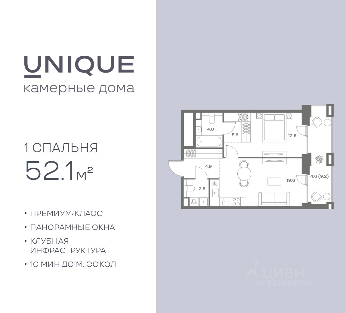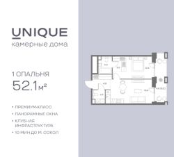 Продается 1-к. квартира номер 58 общей площадью 52.1 кв.м. на 3-м этаже 7 этажного дома, корпус UNIQUE (премиум-класс). Без отделки.
