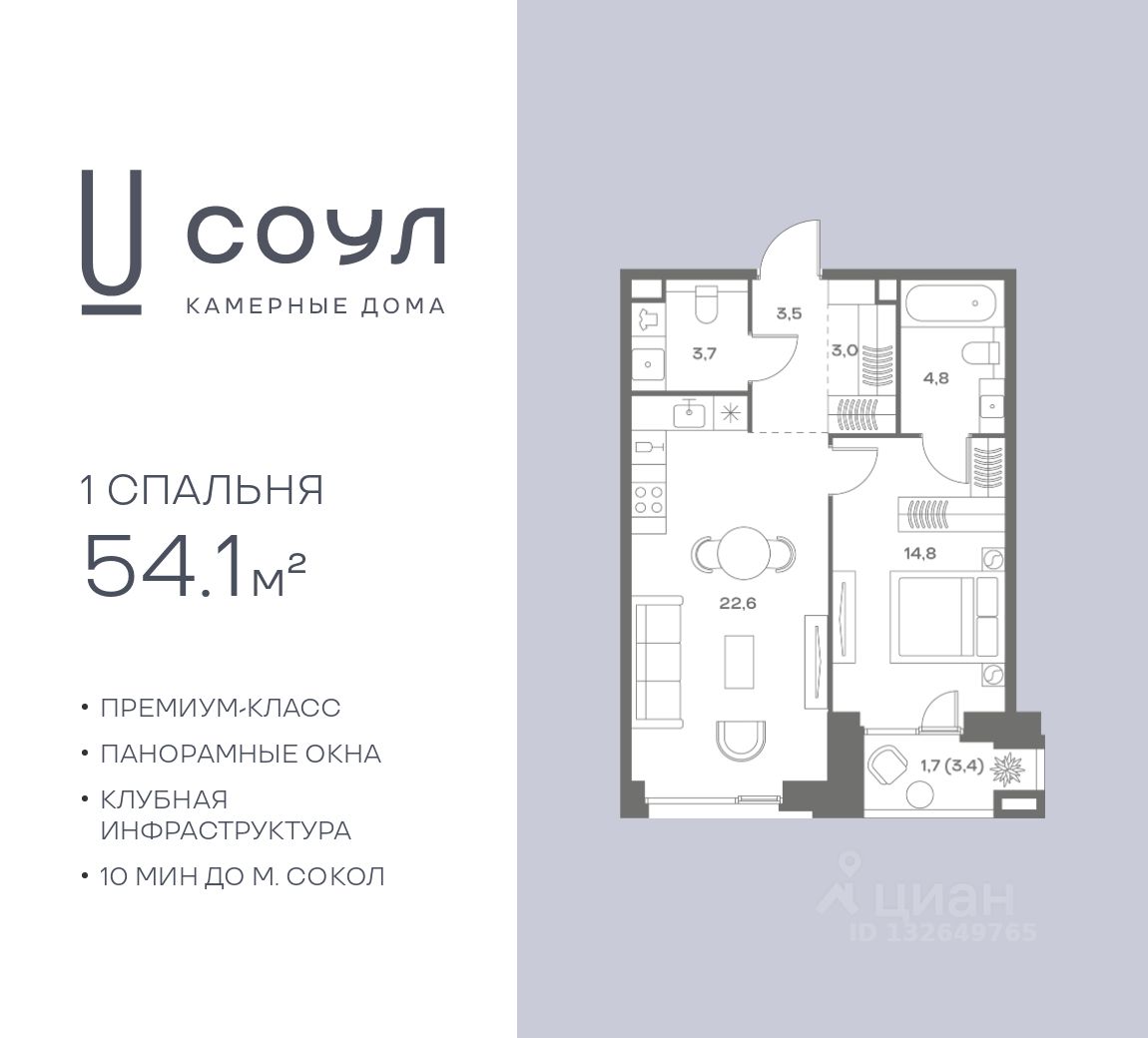 Продается 1-к. квартира номер 267 общей площадью 54.1 кв.м. на 5-м этаже 8 этажного дома, камерные дома СОУЛ (премиум-класс). Без отделки.