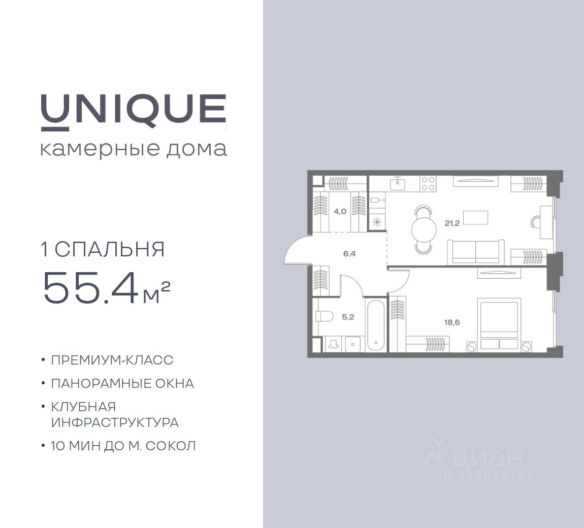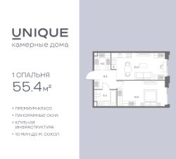 Продается 1-к. квартира номер 140 общей площадью 55.4 кв.м. на 5-м этаже 7 этажного дома, корпус UNIQUE (премиум-класс). Без отделки.