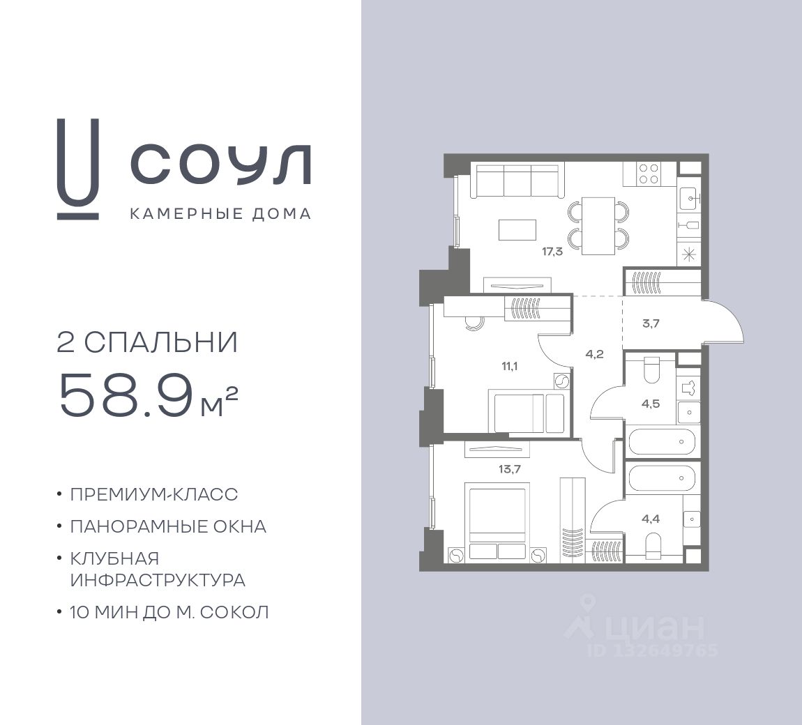 Квартиры с панорамными окнами, мастер-спальнями, гардеробными, классическими балконами и лоджиями, видовыми террасами. Высота потолков от 2,9 до 3,5 м.