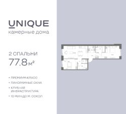 Продается 2-к. квартира номер 108 общей площадью 77.8 кв.м. на 5-м этаже 8 этажного дома, корпус UNIQUE (премиум-класс). Без отделки.