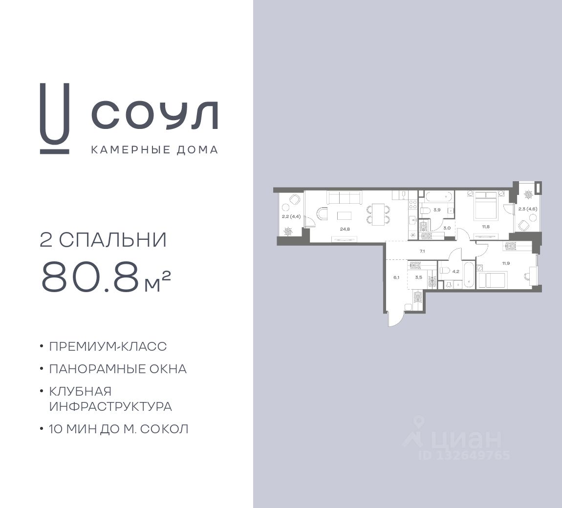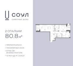 Продается 2-к. квартира номер 162 общей площадью 80.8 кв.м. на 5-м этаже 9 этажного дома, камерные дома СОУЛ (премиум-класс). Без отделки.