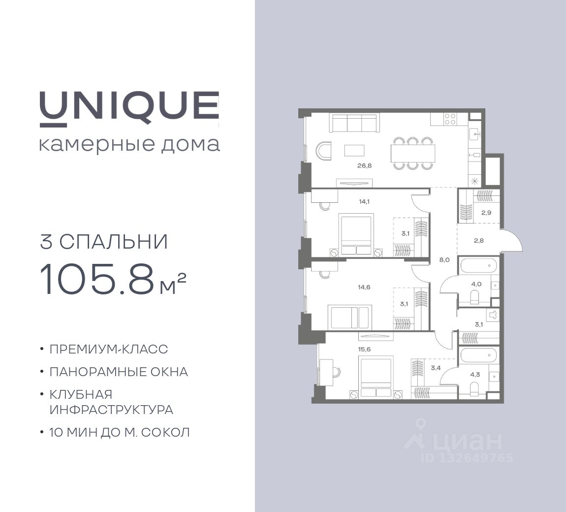 Продается 3-к. квартира номер 228 общей площадью 105.8 кв.м. на 3-м этаже 7 этажного дома, корпус UNIQUE (премиум-класс). Без отделки.