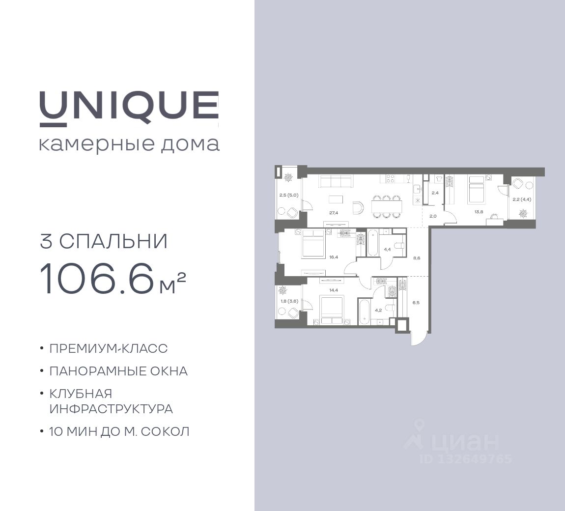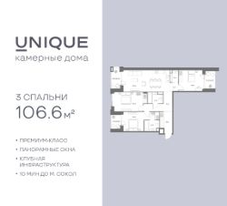 Продается 3-к. квартира номер 213 общей площадью 106.6 кв.м. на 5-м этаже 9 этажного дома, корпус UNIQUE (премиум-класс). Без отделки.