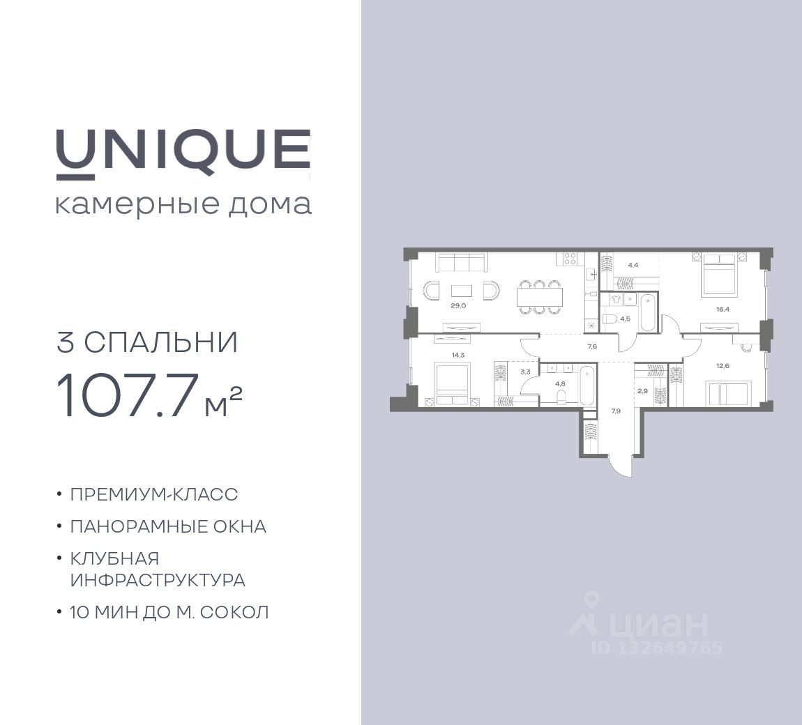 Продается 3-к. квартира номер 229 общей площадью 107.7 кв.м. на 3-м этаже 7 этажного дома, корпус UNIQUE (премиум-класс). Без отделки.
