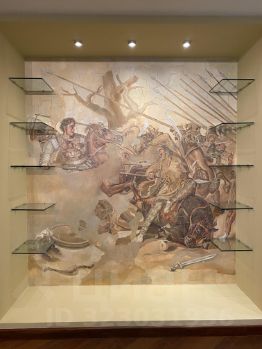 В гостинной, в центральной нише, находится главная художественная доминанта масштабный мурал в виде копии древнеримской мозаики.