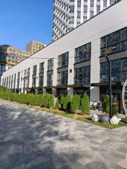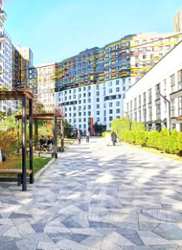 Общественное пространство комплекса оформлено по отличному проекту. Корпуса соединены трехуровневым стилобатом с ландшафтным парком на крыше.