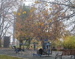 двор с детскими площадками и тренажерами. Много деревьев. Уютный.
