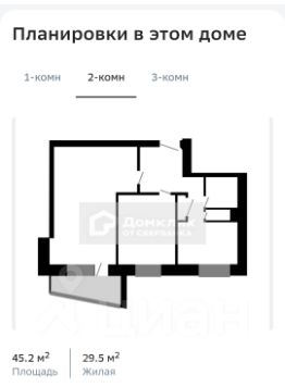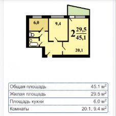 Предлагаем квартиру : Общая площадь 45,1 м² (комнаты 29,5м м², кухня 6.5м²)