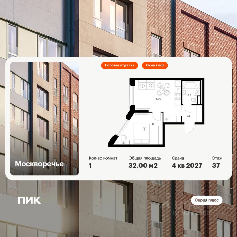 Продаётся 1-комн. квартира площадью 32 кв.м на 37 этаже 39 этажного дома (Корпус 1.3, Секция 4) проекта ПИК Москворечье. Светлый просторный подъезд на уровне земли, функциональная планировка, большие окна, c отделкой.