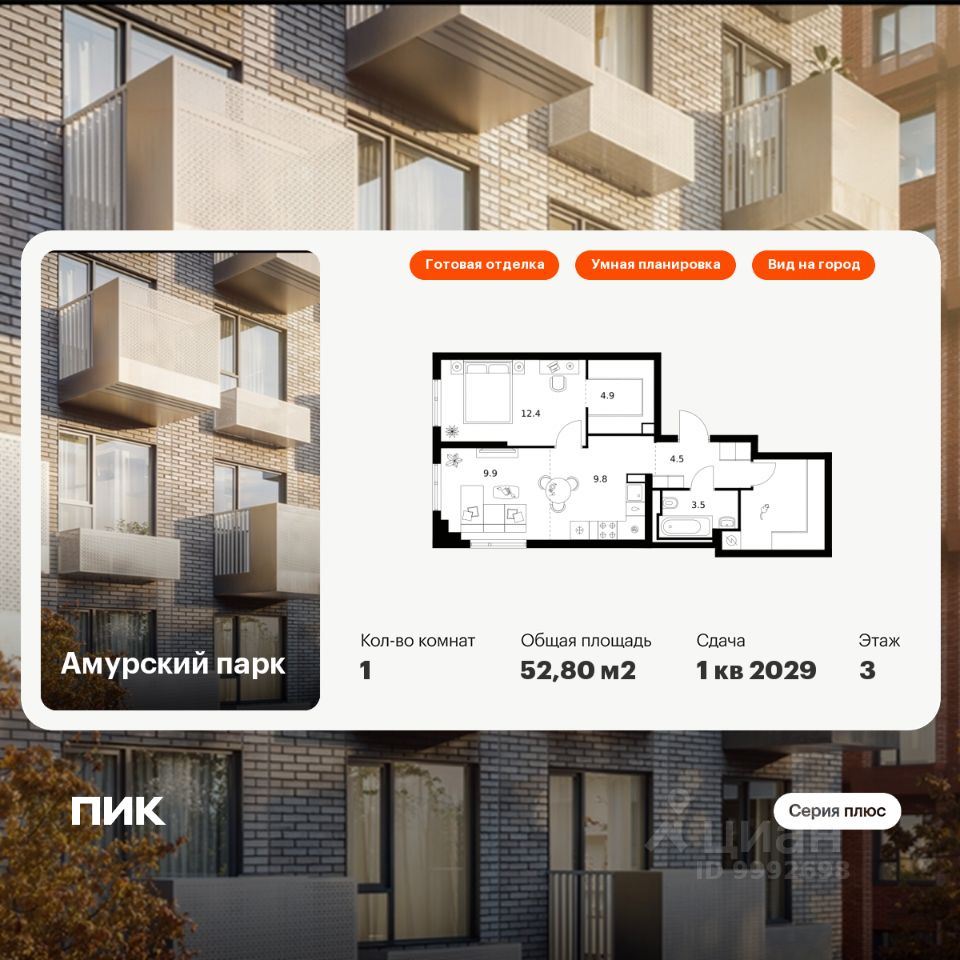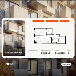 Продаётся 1-комн. квартира площадью 52,8 кв.м на 3 этаже 27 этажного дома (Корпус 4.5, Секция 6) проекта ПИК Амурский парк. Светлый просторный подъезд на уровне земли, функциональная планировка, большие окна, c отделкой.