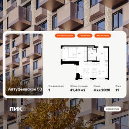 Продаётся 1-комн. квартира площадью 41,4 кв.м на 11 этаже 32 этажного дома (Корпус 1.1, Секция 4) проекта ПИК Алтуфьевское 53. Светлый просторный подъезд на уровне земли, функциональная планировка, большие окна, c отделкой.