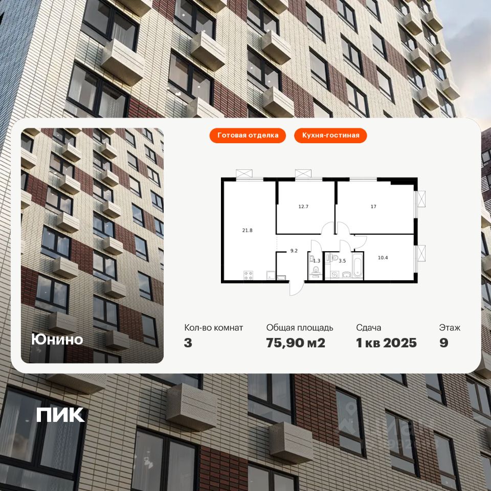Продаётся 3-комн. квартира площадью 75,9 кв.м на 9 этаже 17 этажного дома (Корпус 1.1, Секция 1) проекта ПИК Юнино. Светлый просторный подъезд на уровне земли, функциональная планировка, большие окна, c отделкой.