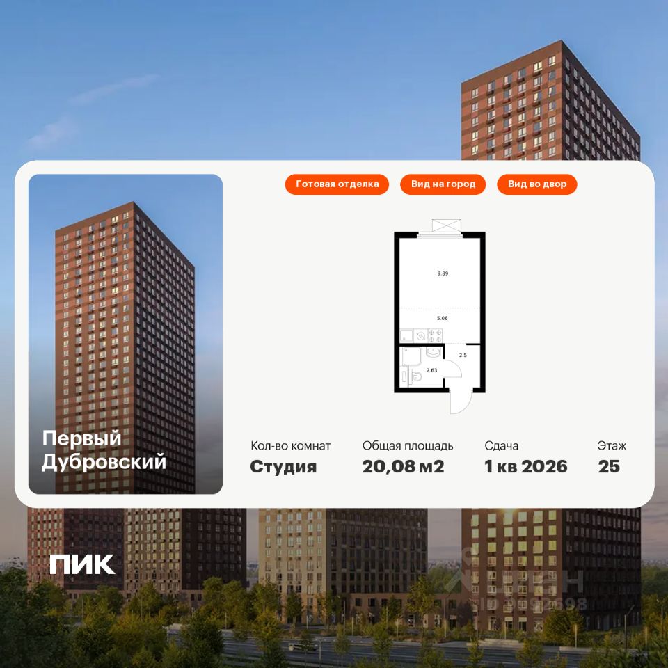 Продаётся квартира-студия площадью 20,08 кв.м на 25 этаже 33 этажного дома (Корпус 1.3, Секция 1) проекта ПИК Первый Дубровский. Светлый просторный подъезд на уровне земли, функциональная планировка, большие окна, c отделкой.
