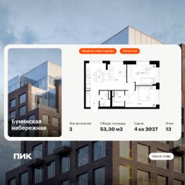Продаётся 2-комн. квартира площадью 53,3 кв.м на 13 этаже 16 этажного дома (Корпус 2.6/1.2, Секция 2) проекта ПИК Бунинская набережная. Светлый просторный подъезд на уровне земли, функциональная планировка, большие окна, предчистовая отделка.