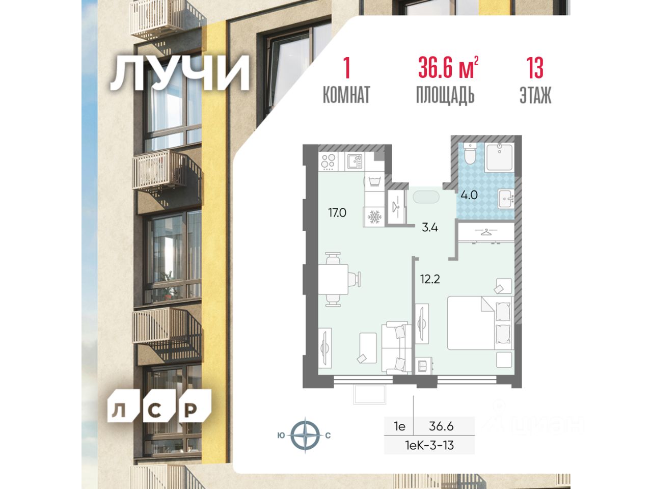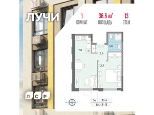 Продается 1-комнатная квартира общей площадью 36.6 кв. метров на 13 этаже жилого комплекса Лучи.